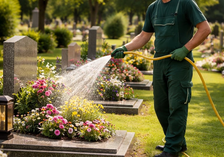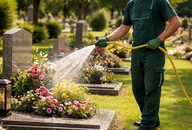 Confiez-nous le soin de vos espaces avec nos services de nettoyage, d'entretien et de fleurissement de sépulture, pour un hommage éclatant et respectueux.
